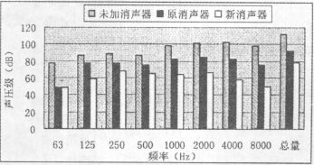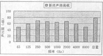 取下原消聲器,將新設(shè)計(jì)好的消聲器安裝在原機(jī)組上,其它實(shí)驗(yàn)條件不變,對(duì)新消聲器對(duì)各頻段的消聲量及總消聲量進(jìn)行測(cè)量,其結(jié)果見圖4。
